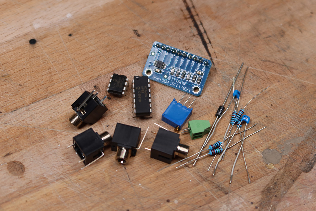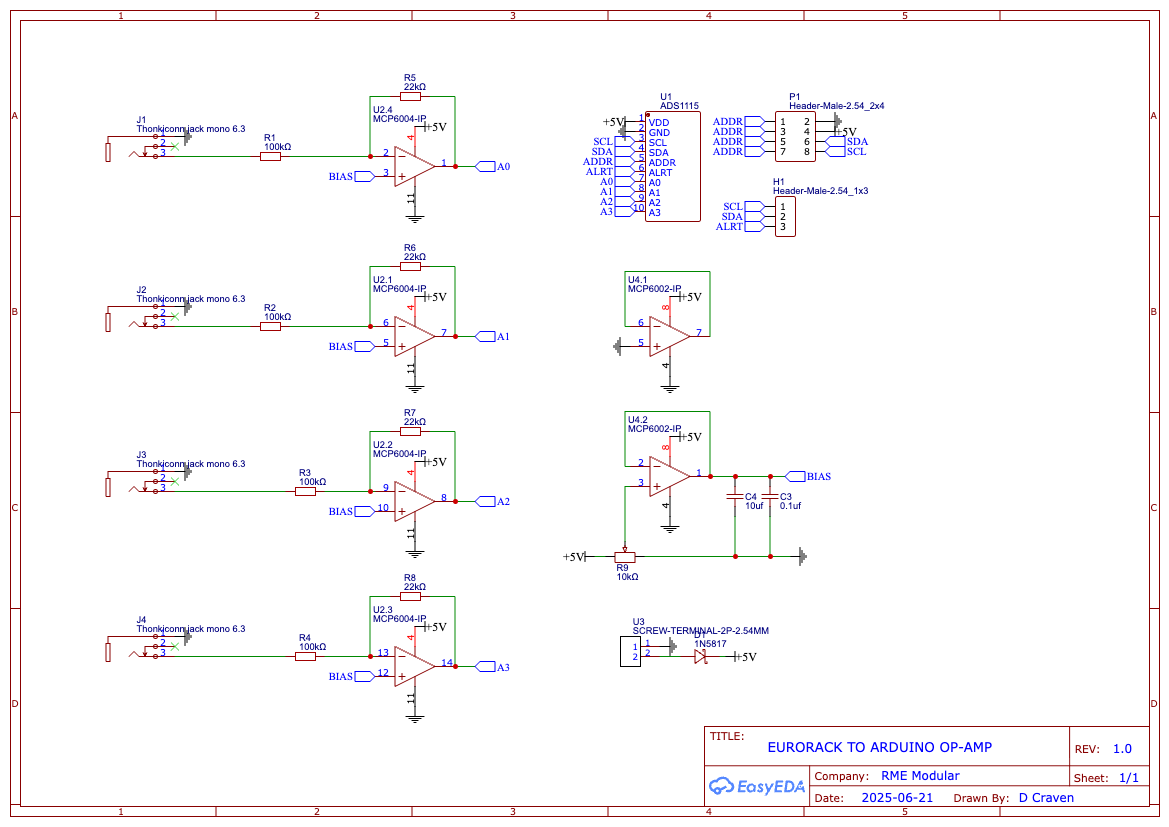 To read control voltage from Eurorack gear, I added a high-resolution ADC, the ADS1115. But Eurorack signals can be wild—±5V, ±10V, gates, triggers—so I built custom op-amp circuits to scale and bias those voltages into safe, Arduino-friendly levels.