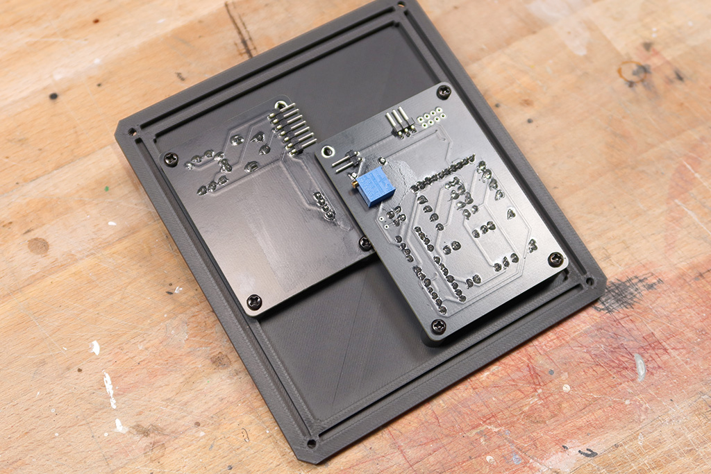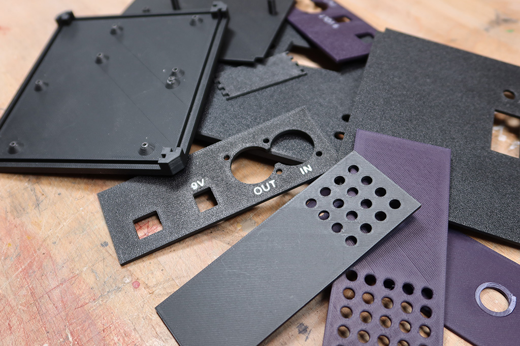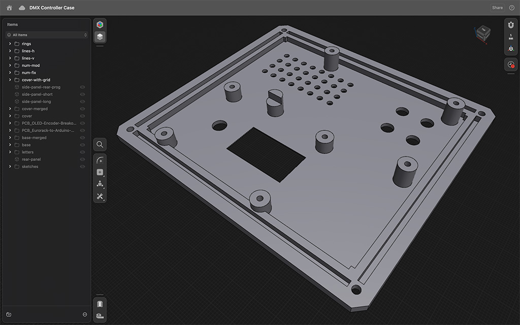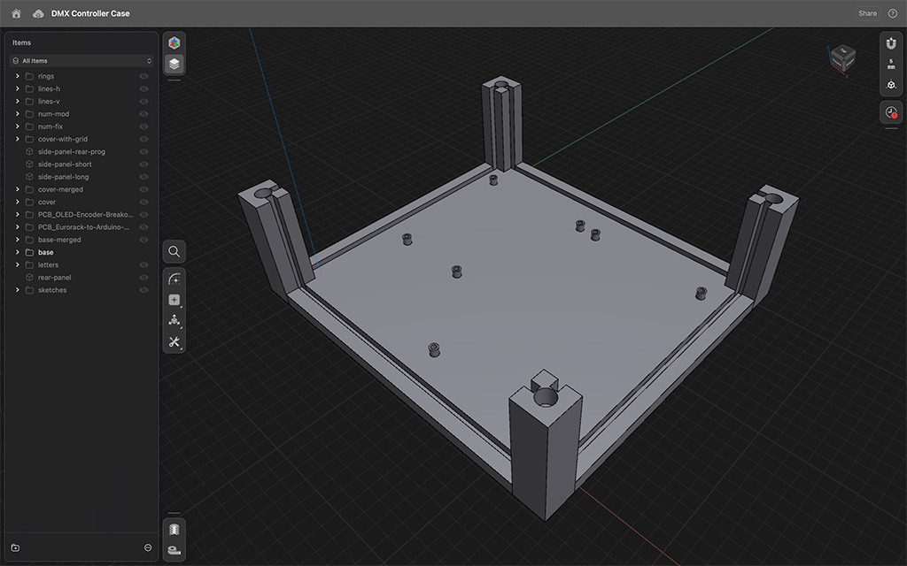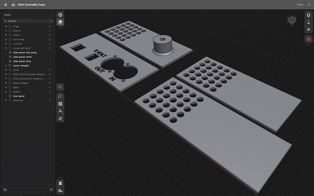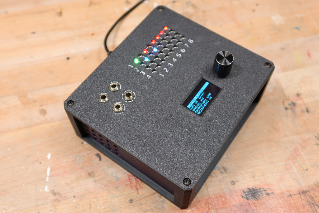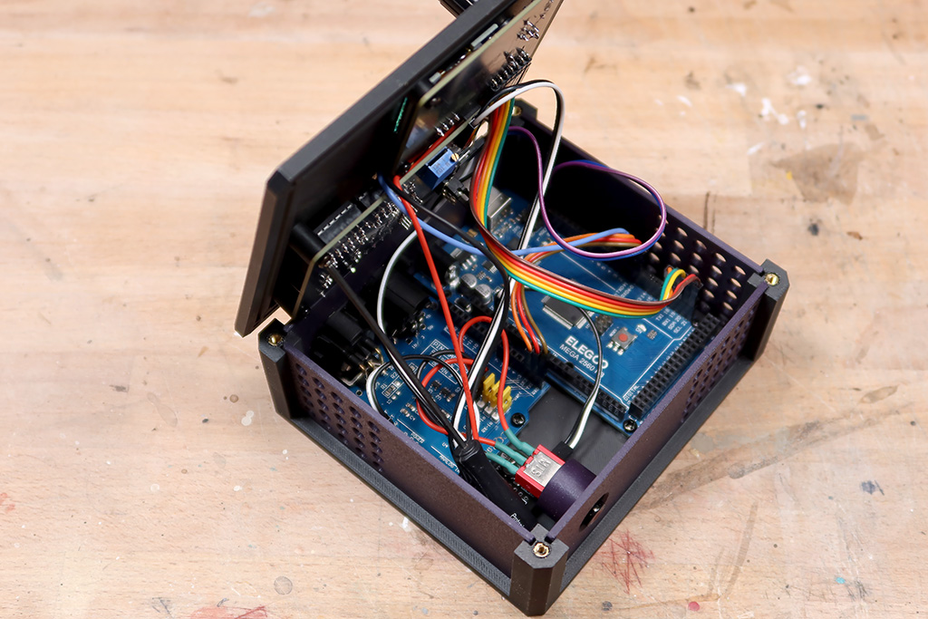 The enclosure came next. It had to hold a lot: the Arduino Mega, DMX driver board, op-amp PCB, OLED/encoder PCB, and a momentary switch for programming. It also needed to look good on a synth table, take a beating, and feel like a finished instrument—not a prototype in a box. I modeled the case in 3D, printed multiple iterations, and kept tweaking until everything fit together like a proper performance tool.