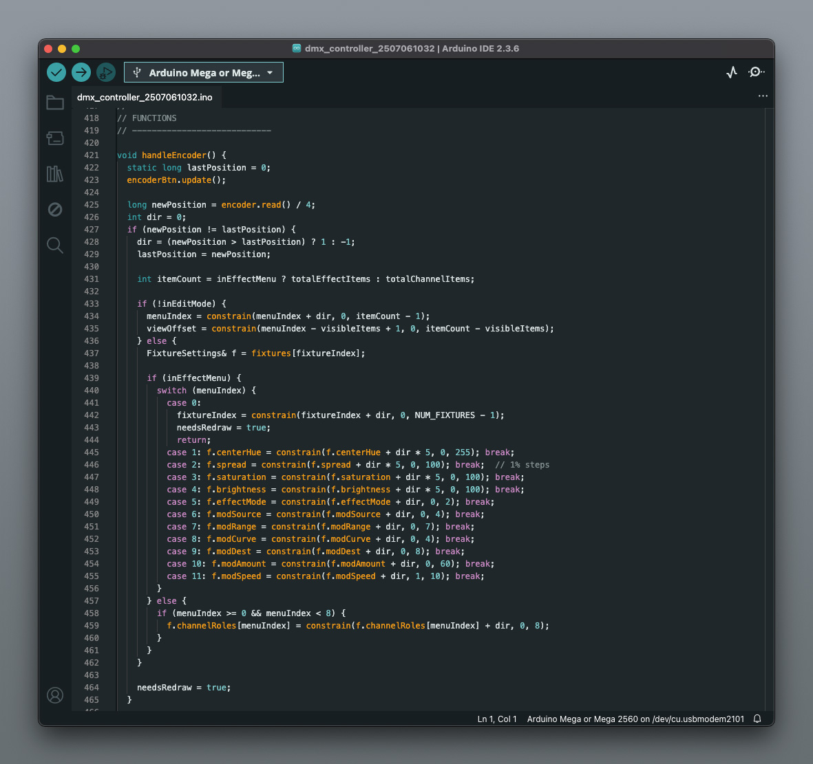 The firmware had to do a lot: handle UI navigation, manage DMX output, interpret modulation sources, apply effects, and save everything to memory. The user interface needed to be responsive, flexible, and easy enough to use mid-patch without losing the vibe.
